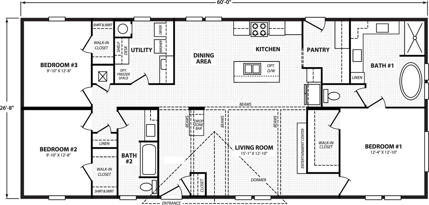 The Vivid 28603N is a graceful double-wide manufactured home offering about 1,600 square feet of thoughtfully arranged living space. Its layout features three bedrooms and two full bathrooms, with a split plan that places the primary suite on one side for privacy while the secondary bedrooms and guest bath occupy the opposite wing. The heart of the home is the open living, dining, and kitchen area, which flows seamlessly and is ideal for both everyday life and entertaining. A sizable kitchen island, abundant cabinetry, and smart design touches boost functionality, while the overall floor plan strikes a balance between comfort, efficiency, and modern warmth.